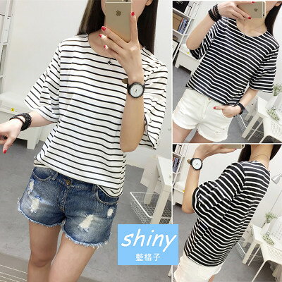 出自:線上購物分享 - 399超商免運 599折30 輸入代號 M7OJ-IPQJ-ZB18-R5YO【V8088】shiny藍格子-好感甜搭.條紋圓領喇叭袖短袖上衣
